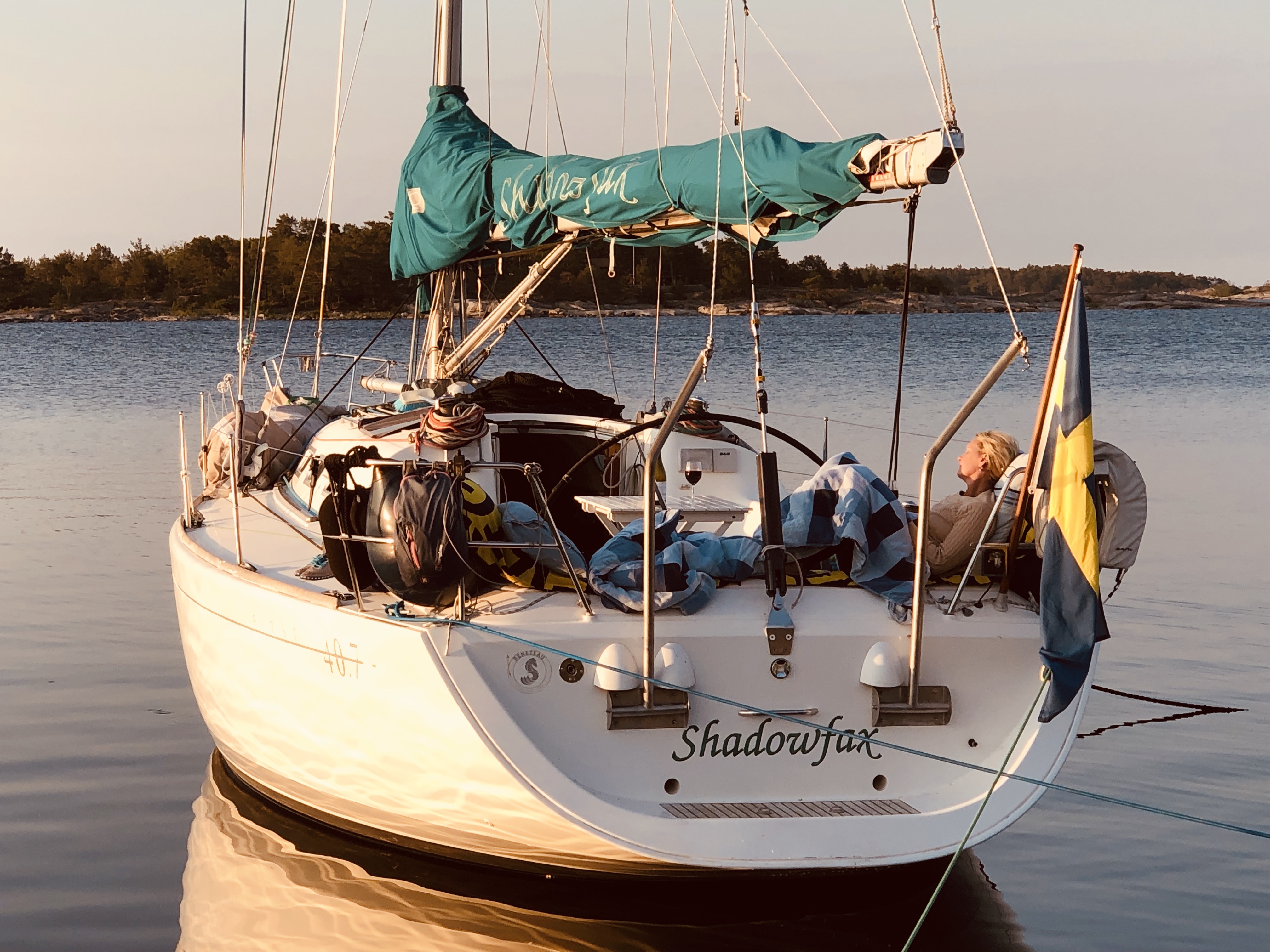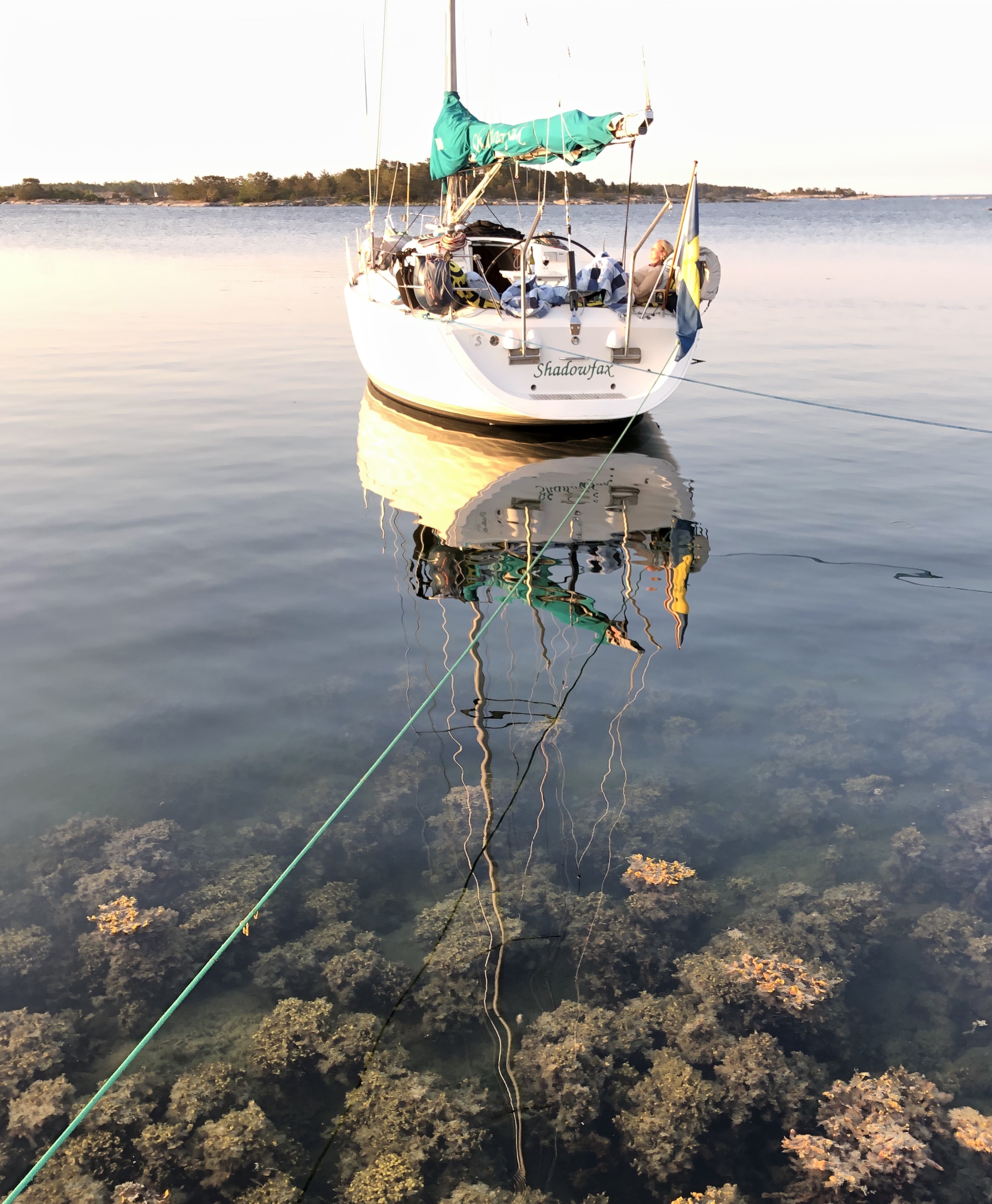Lite senare och rörigare än vanligt kommer vi ut med Shadowfax. Efter 24 timmars fix och trix seglar vi äntligen av från Träskö, sydliga vindar runt 6 m/s, klarblå himmel. Vi kryssar väster om Möja och bestämmer oss för att söka natthamn i Östra Möja skärgård. Vindarna ligger rätt för en plats vi spanat många ggr på ”Bodkobben” – kommer inte riktigt iland men det blir bra – nytt favvoställe 🙂