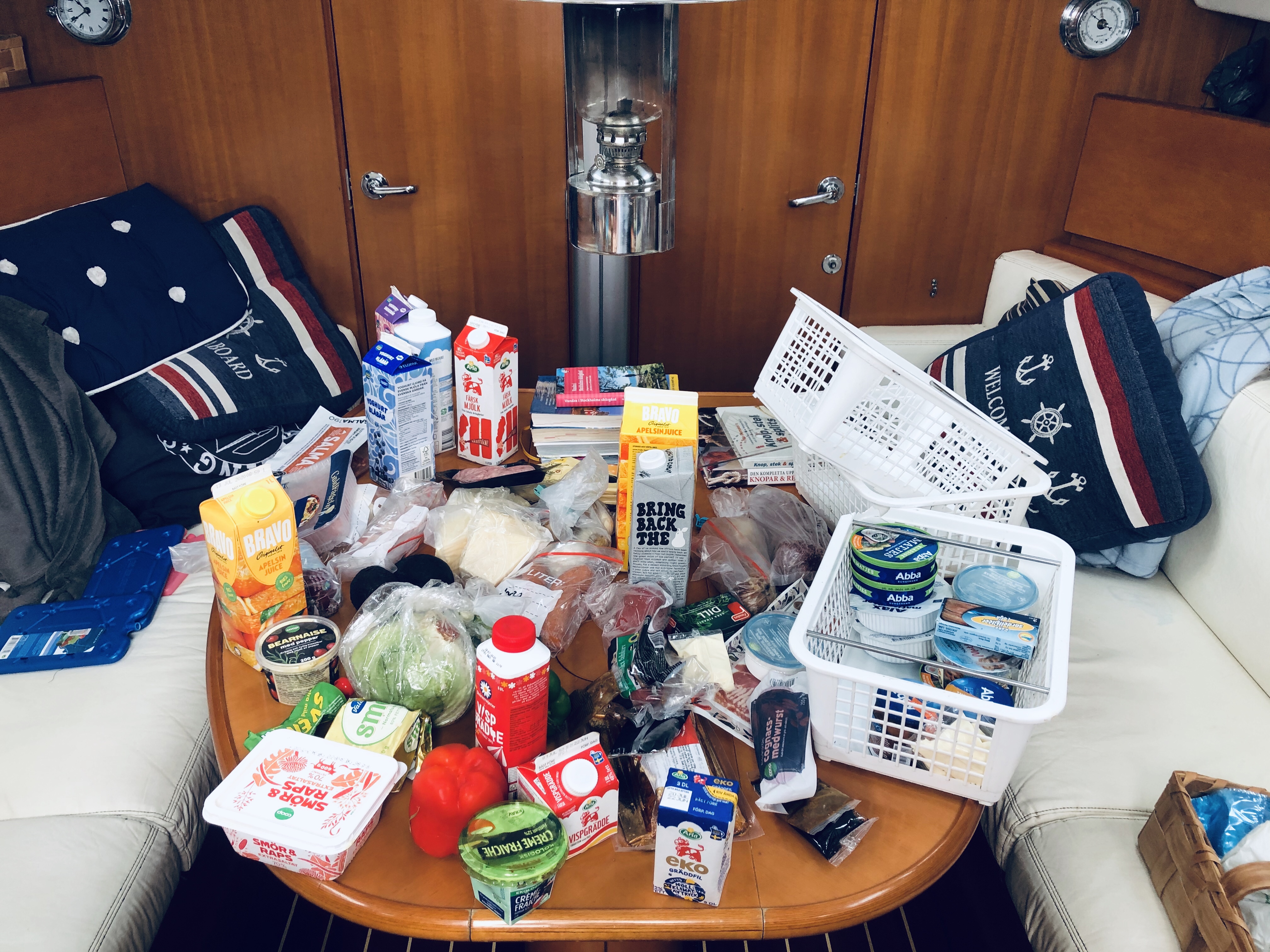 Efter morgonpromenad på ön och lite yoga har vi städat och fixat. Kylskåpet behövde torkas ur, toan lagas och riggen sättas. Det blåser mycket och viner i masten och förstaget slår. Lunch och en sommarpratare har vi också hunnit. Semestertempot början infinna sig.